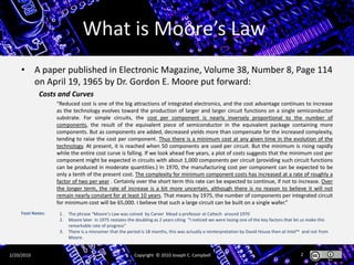 The document discusses Moore's Law, which states that the number of components on integrated circuits doubles approximately every two years, leading to reduced costs and increased complexity. It highlights historical perspectives on the law, its comparison with energy trends, and its implications for future technological advancements. The author emphasizes the importance of Moore's Law as a driver of economic growth and innovation while addressing challenges that may limit its applicability in the future.