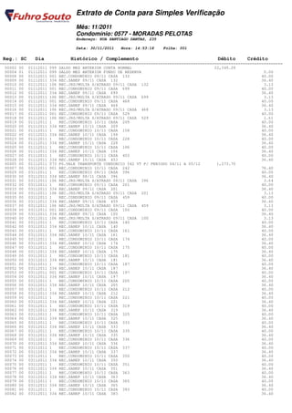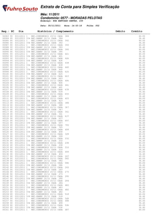 para Simples Verificação Mês: 11/2011 Condomínio: 0577 - MORADAS PELOTAS Endereço: RUA SANTIAGO DANTAS, 235 Data: 30/11/2011 Hora: 14:53:18 Folha: 001 Reg.: SC Dia Histórico / Complemento Débito Crédito ======================================================================================================================== 00002 00 01112011 099 SALDO MES ANTERIOR CONTA NORMAL 22,349.29 00004 01 01112011 099 SALDO MES ANTERIOR FUNDO DE RESERVA 0.00 00008 00 01112011 001 REC.CONDOMINIO 09/11 CASA 132 40.00 00009 00 01112011 334 REC.SANEP 09/11 CASA 132 36.40 00010 00 01112011 106 REC.JRS/MULTA S/ATRASO 09/11 CASA 132 3.13 00011 00 01112011 001 REC.CONDOMINIO 09/11 CASA 699 40.00 00012 00 01112011 334 REC.SANEP 09/11 CASA 699 36.40 00013 00 01112011 106 REC.JRS/MULTA S/ATRASO 09/11 CASA 699 3.13 00014 00 01112011 001 REC.CONDOMINIO 09/11 CASA 468 40.00 00015 00 01112011 334 REC.SANEP 09/11 CASA 468 36.40 00016 00 01112011 106 REC.JRS/MULTA S/ATRASO 09/11 CASA 468 3.13 00017 00 01112011 001 REC.CONDOMINIO 09/11 CASA 529 40.00 00018 00 01112011 106 REC.JRS/MULTA S/ATRASO 09/11 CASA 529 1.61 00019 00 01112011 1 REC.CONDOMINIO 10/11 CASA 209 40.00 00020 00 01112011 334 REC.SANEP 10/11 CASA 209 36.40 00021 00 01112011 1 REC.CONDOMINIO 10/11 CASA 158 40.00 00022 00 01112011 334 REC.SANEP 10/11 CASA 158 36.40 00023 00 01112011 1 REC.CONDOMINIO 10/11 CASA 228 40.00 00024 00 01112011 334 REC.SANEP 10/11 CASA 228 36.40 00025 00 01112011 1 REC.CONDOMINIO 10/11 CASA 106 40.00 00026 00 01112011 334 REC.SANEP 10/11 CASA 106 36.40 00027 00 01112011 1 REC.CONDOMINIO 10/11 CASA 453 40.00 00028 00 01112011 334 REC.SANEP 10/11 CASA 453 36.40 00005 00 01112011 073 PG.VALE TRANSPORTE CONSORCIO 542 VT P/ PERIODO 04/11 A 05/12 1,273.70 00007 00 03112011 001 REC.CONDOMINIO 10/11 CASA 242 76.40 00029 00 03112011 1 REC.CONDOMINIO 08/11 CASA 396 40.00 00030 00 03112011 334 REC.SANEP 08/11 CASA 396 36.40 00031 00 03112011 106 REC.JRS/MULTA S/ATRASO 08/11 CASA 396 3.64 00032 00 03112011 1 REC.CONDOMINIO 09/11 CASA 201 40.00 00033 00 03112011 334 REC.SANEP 09/11 CASA 201 36.40 00034 00 03112011 106 REC.JRS/MULTA S/ATRASO 09/11 CASA 201 3.13 00035 00 03112011 1 REC.CONDOMINIO 09/11 CASA 459 40.00 00036 00 03112011 334 REC.SANEP 09/11 CASA 459 36.40 00037 00 03112011 106 REC.JRS/MULTA S/ATRASO 09/11 CASA 459 3.13 00038 00 03112011 001 REC.CONDOMINIO 09/11 CASA 100 40.00 00039 00 03112011 334 REC.SANEP 09/11 CASA 100 36.40 00040 00 03112011 106 REC.JRS/MULTA S/ATRASO 09/11 CASA 100 3.13 00041 00 03112011 1 REC.CONDOMINIO 10/11 CASA 140 40.00 00042 00 03112011 334 REC.SANEP 10/11 CASA 140 36.40 00043 00 03112011 1 REC.CONDOMINIO 10/11 CASA 161 40.00 00044 00 03112011 334 REC.SANEP 10/11 CASA 161 36.40 00045 00 03112011 1 REC.CONDOMINIO 10/11 CASA 174 40.00 00046 00 03112011 334 REC.SANEP 10/11 CASA 174 36.40 00047 00 03112011 1 REC.CONDOMINIO 10/11 CASA 175 40.00 00048 00 03112011 334 REC.SANEP 10/11 CASA 175 36.40 00049 00 03112011 1 REC.CONDOMINIO 10/11 CASA 181 40.00 00050 00 03112011 334 REC.SANEP 10/11 CASA 181 36.40 00051 00 03112011 1 REC.CONDOMINIO 10/11 CASA 187 40.00 00052 00 03112011 334 REC.SANEP 10/11 CASA 187 36.40 00053 00 03112011 001 REC.CONDOMINIO 10/11 CASA 197 40.00 00054 00 03112011 334 REC.SANEP 10/11 CASA 197 36.40 00055 00 03112011 1 REC.CONDOMINIO 10/11 CASA 205 40.00 00056 00 03112011 334 REC.SANEP 10/11 CASA 205 36.40 00057 00 03112011 1 REC.CONDOMINIO 10/11 CASA 212 40.00 00058 00 03112011 334 REC.SANEP 10/11 CASA 212 36.40 00059 00 03112011 1 REC.CONDOMINIO 10/11 CASA 221 40.00 00060 00 03112011 334 REC.SANEP 10/11 CASA 221 36.40 00061 00 03112011 1 REC.CONDOMINIO 10/11 CASA 319 40.00 00062 00 03112011 334 REC.SANEP 10/11 CASA 319 36.40 00063 00 03112011 1 REC.CONDOMINIO 10/11 CASA 325 40.00 00064 00 03112011 334 REC.SANEP 10/11 CASA 325 36.40 00065 00 03112011 1 REC.CONDOMINIO 10/11 CASA 333 40.00 00066 00 03112011 334 REC.SANEP 10/11 CASA 333 36.40 00067 00 03112011 1 REC.CONDOMINIO 10/11 CASA 335 40.00 00068 00 03112011 334 REC.SANEP 10/11 CASA 335 36.40 00069 00 03112011 1 REC.CONDOMINIO 10/11 CASA 336 40.00 00070 00 03112011 334 REC.SANEP 10/11 CASA 336 36.40 00071 00 03112011 1 REC.CONDOMINIO 10/11 CASA 337 40.00 00072 00 03112011 334 REC.SANEP 10/11 CASA 337 36.40 00073 00 03112011 1 REC.CONDOMINIO 10/11 CASA 350 40.00 00074 00 03112011 334 REC.SANEP 10/11 CASA 350 36.40 00075 00 03112011 1 REC.CONDOMINIO 10/11 CASA 351 40.00 00076 00 03112011 334 REC.SANEP 10/11 CASA 351 36.40 00077 00 03112011 1 REC.CONDOMINIO 10/11 CASA 363 40.00 00078 00 03112011 334 REC.SANEP 10/11 CASA 363 36.40 00079 00 03112011 1 REC.CONDOMINIO 10/11 CASA 365 40.00 00080 00 03112011 334 REC.SANEP 10/11 CASA 365 36.40 00081 00 03112011 1 REC.CONDOMINIO 10/11 CASA 383 40.00 00082 00 03112011 334 REC.SANEP 10/11 CASA 383 36.40