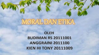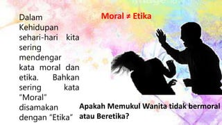 Dokumen tersebut membahas perbedaan antara etika dan moral. Etika merujuk pada filsafat moral sebagai pemikiran kritis tentang ajaran-ajaran moral, sedangkan moral berkaitan dengan aturan yang harus dilakukan manusia agar menjadi lebih baik sesuai adat istiadat masyarakat. Dokumen juga membedakan makna kata-kata terkait seperti etis, etos, amoral, dan immoral.