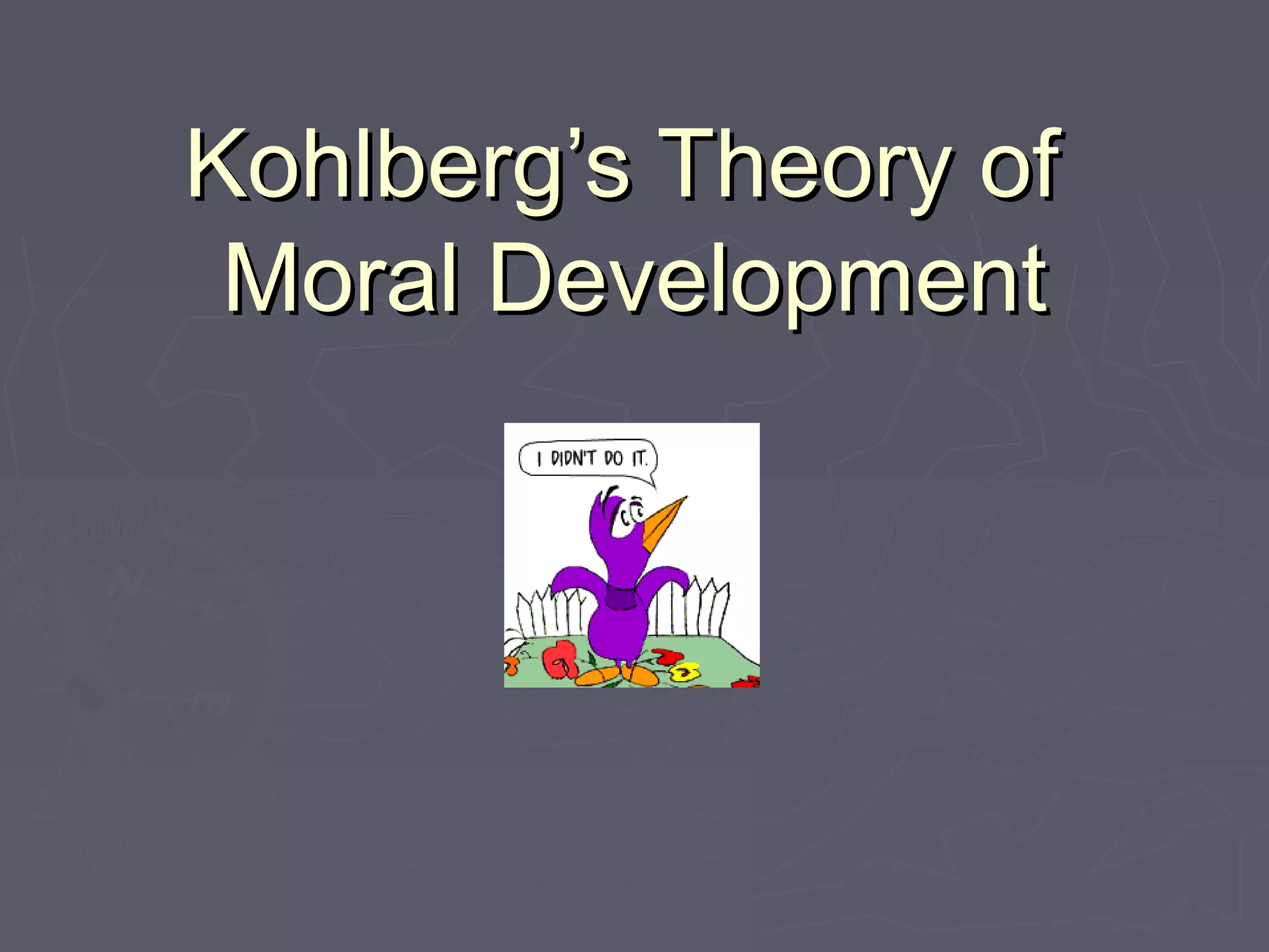Kohlberg's theory proposes six stages of moral development centered around concepts of justice, grouped into three levels. The document outlines the six stages, describing their key features and focus on obedience, self-interest, conformity, law and order, social contracts, and universal ethical principles. It also provides examples and criticisms of Kohlberg's theory, questioning if it fully accounts for moral behavior and non-Western perspectives.