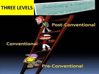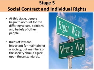 This document summarizes Lawrence Kohlberg's theory of moral development, which proposes that moral reasoning develops through six stages grouped into three levels - pre-conventional, conventional, and post-conventional. It describes the characteristics of reasoning at each of the first four stages, focusing on obeying rules to avoid punishment (Stage 1), self-interest exchange (Stage 2), interpersonal accord and expectations (Stage 3), and upholding laws and social order (Stage 4). An example is given to illustrate potential responses from each of these stages.