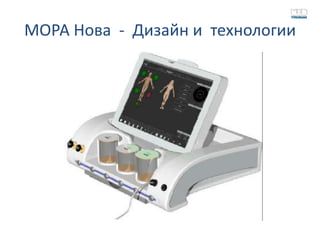 Документ описывает устройство и функции медицинского аппарата 'мора нова', включая его интерфейс, технологии и варианты использования. Он оснащен сенсорным дисплеем, различными электродами, модульной архитектурой и поддерживает интеграцию с компьютерами под управлением Windows. Также обсуждаются перспективные возможности дальнейшего развития устройства в области медицинской терапии.
