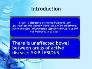 This document provides information on Crohn's disease, including that it is a chronic inflammatory bowel disease characterized by transmural inflammation that can affect any part of the digestive tract. The cause is unknown but likely involves genetic and environmental factors. Symptoms include diarrhea, abdominal pain, weight loss and fever. Complications can include bowel obstruction, abscesses, and fistulas. Diagnosis involves blood tests, stool samples, endoscopy, and imaging. Treatment depends on severity but may include medications like corticosteroids, immunosuppressants, TNF-alpha inhibitors, antibiotics, and nutritional support.