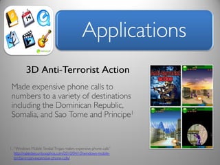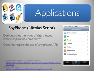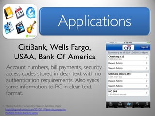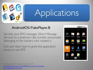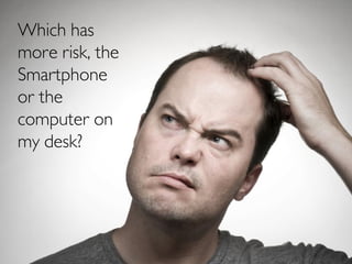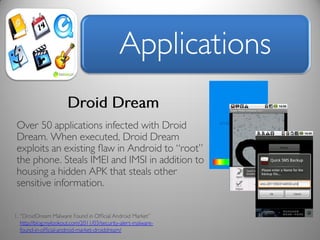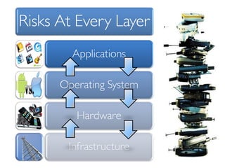 The document discusses risk and defines it as the possibility of loss or injury. It then discusses crowd sourcing security testing and outlines some of the current inadequate solutions such as expensive security consultants, tools that don't scale, and developers who prioritize functionality over security. The document then summarizes the results of analyzing over 53,000 Android applications, finding most request GPS and contact permissions and lists the top third party libraries used. It concludes by proposing a whitelisting approach to security testing using static analysis and an unbiased third party.