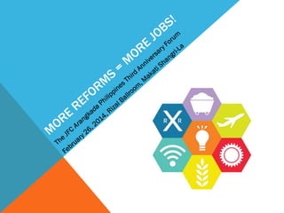 The document summarizes an event discussing the third assessment of the Arangkada Philippines Project (TAPP). The event will observe the third anniversary of TAPP's launch, release the third assessment, and bring together experts to discuss reforms to promote jobs. It provides an agenda for presentations and panel discussions on economic growth, competitiveness, sectors, and reforms. It also summarizes TAPP's activities over three years and the assessments' findings on Philippines' competitiveness rankings and recommendations.