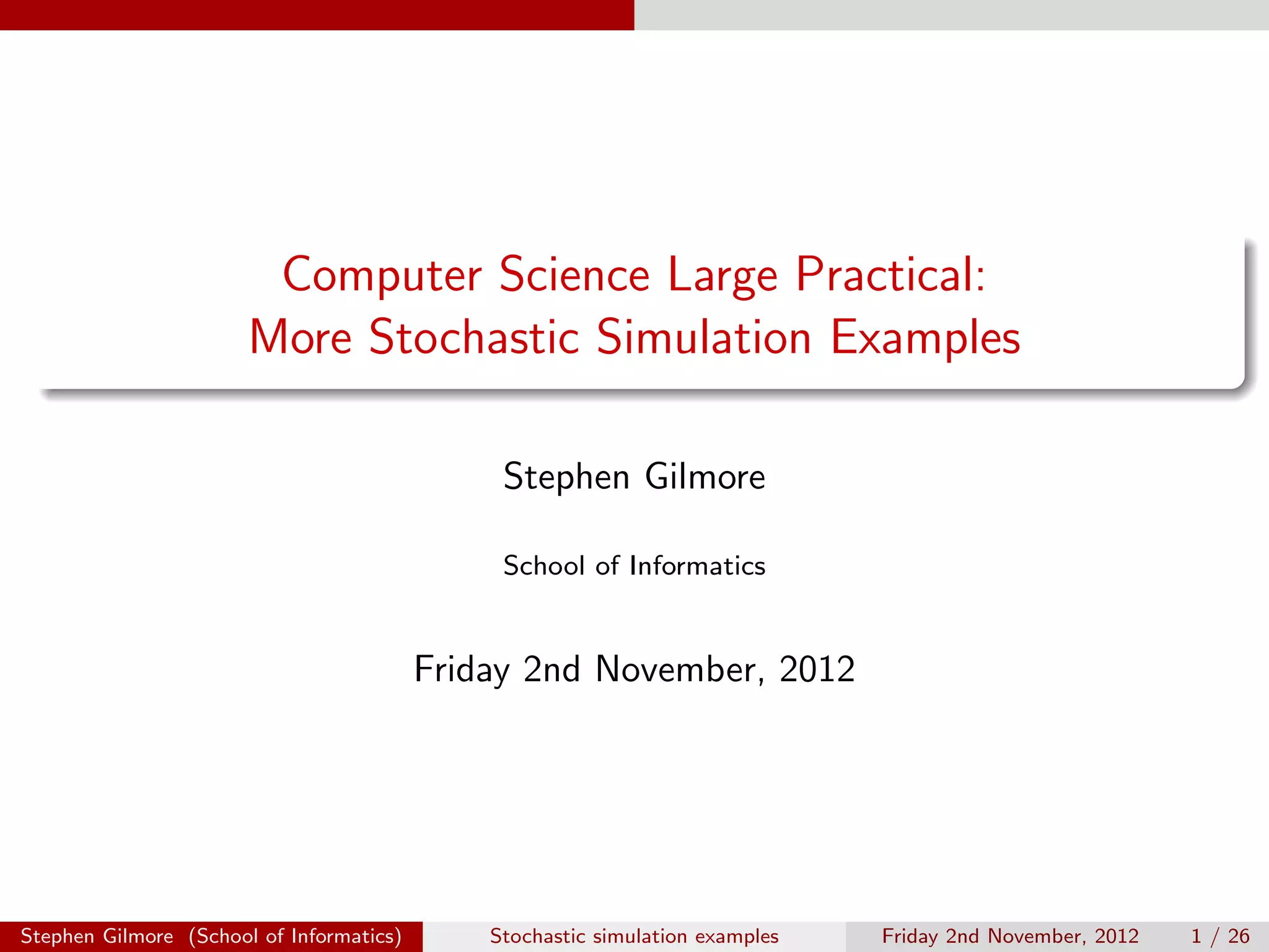 The document describes stochastic simulations of chemical reaction cascades. It discusses simulating a series of reactions (A to B, B to C, etc.) at different rates. A simulation script is provided, and sample output shows species A decreasing while B increases over the first second. The model is expanded to allow species E to decay via a new reaction. Visualizations show this does not affect A-D profiles but changes E's profile. Faster decay of E is also discussed.