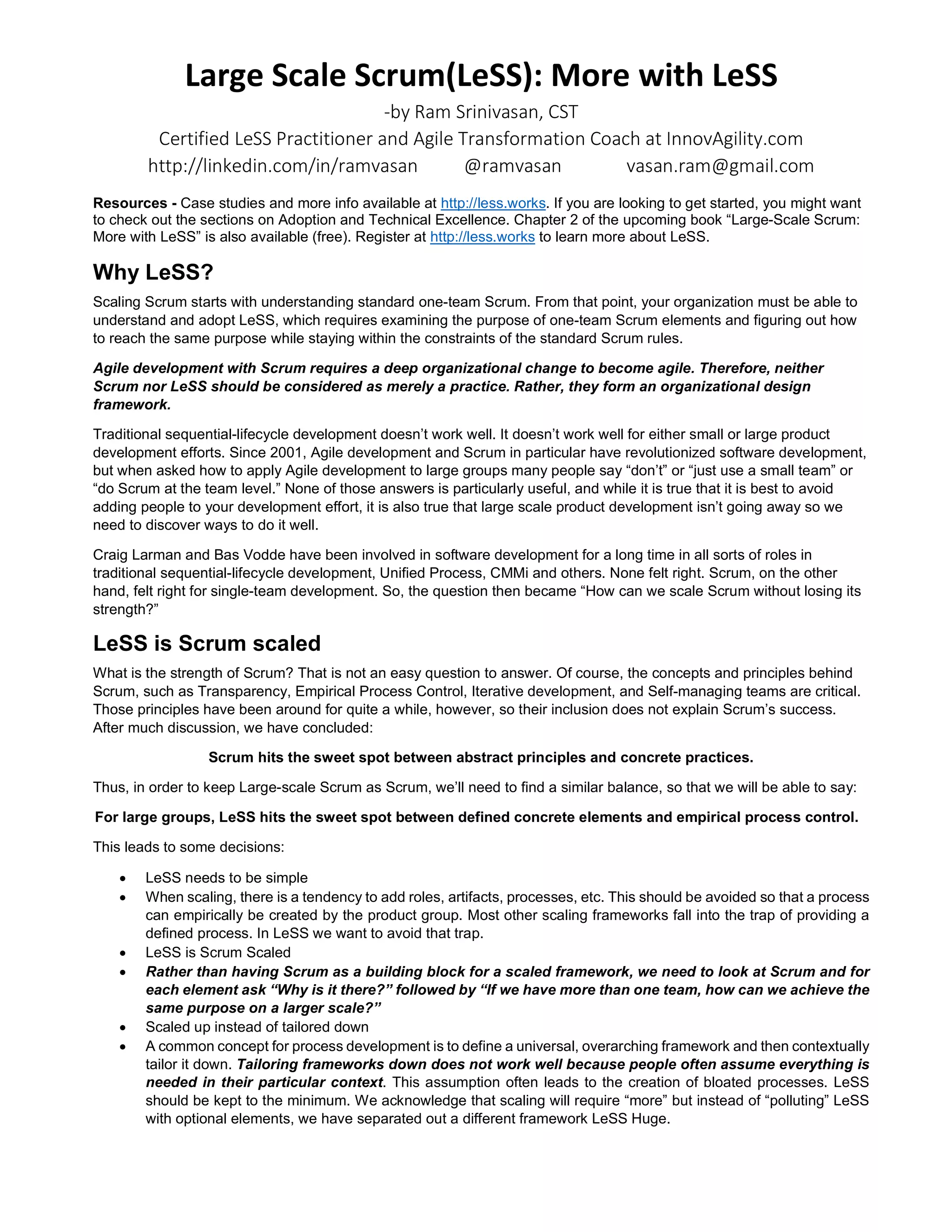 - The document discusses Large Scale Scrum (LeSS), a framework for applying Scrum principles to large, multi-team projects.