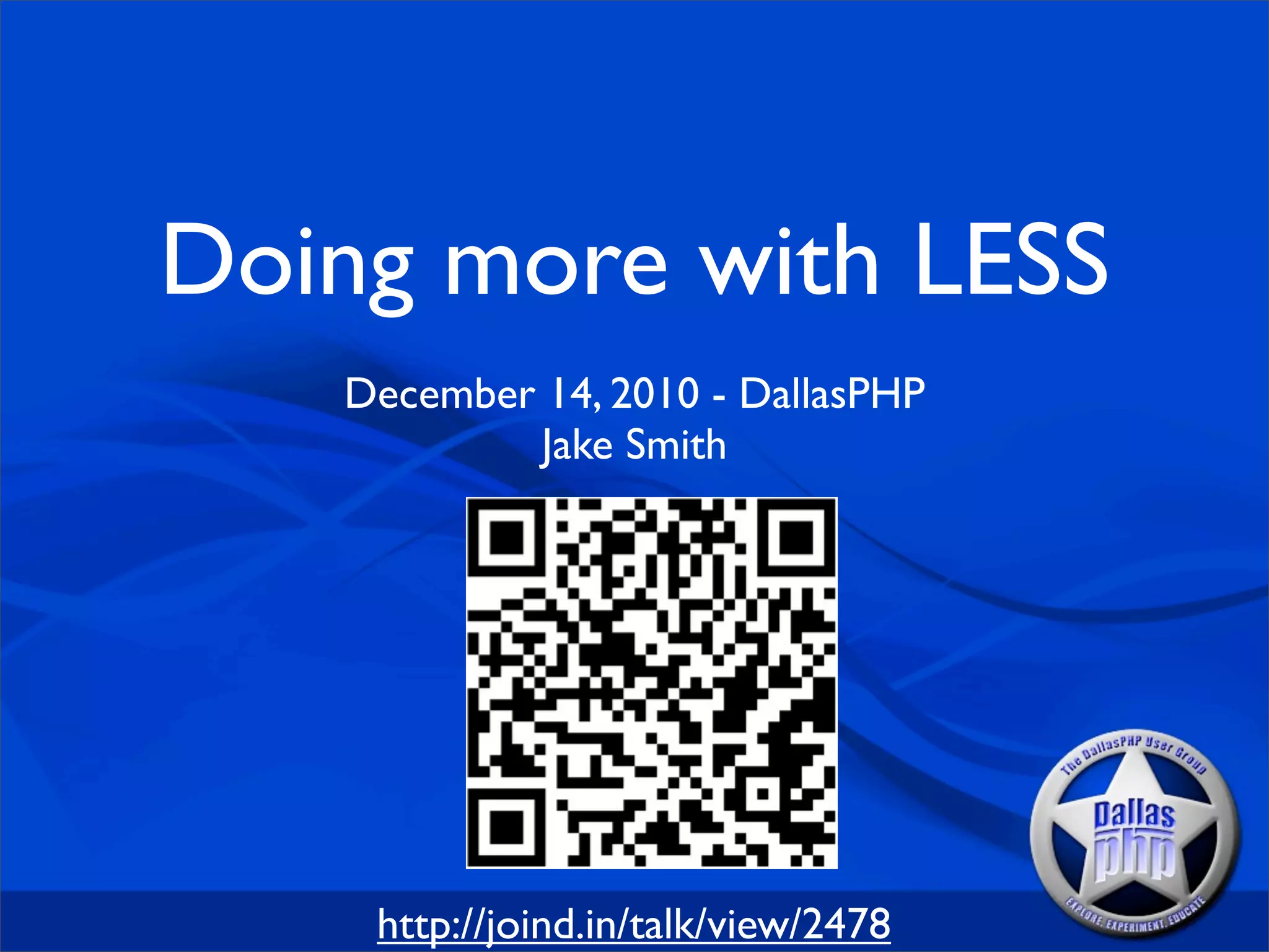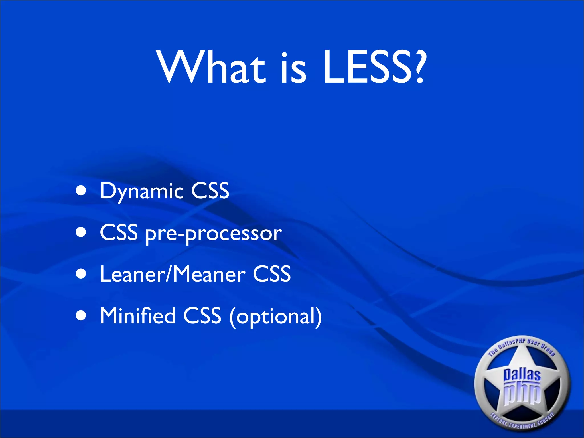 This document discusses the CSS preprocessor LESS and its features. LESS allows for nested rules, mixins, variables, imports and operators to make CSS more maintainable. It can be run from Node.js or a browser and compiles LESS files into normal CSS. Key features include mixins for common CSS patterns, variables for consistency, nesting for organization and imports to modularize code. LESS aims to make CSS leaner, meaner and more dynamic through its preprocessing abilities.