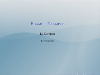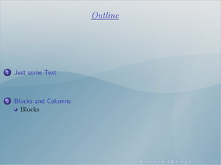 The document contains a presentation on Beamer with sections on text, blocks, columns, and equations. It includes examples of normal text, alerted text, inline math, displayed math, and quotations. There are also examples of blocks for important information, alerts, and examples. The purpose is to demonstrate different elements that can be included in a Beamer presentation.