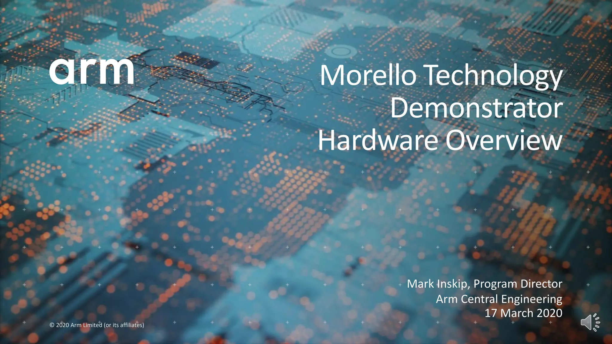 The document provides an overview of the Morello technology demonstrator hardware, detailing its CPU architecture, hardware capabilities, and development phases. It highlights the specific features of the Morello board, including multiple CPU clusters, memory interfaces, and GPU specifications. Additionally, it discusses the hardware roll-out and future software support for the Morello architecture.
