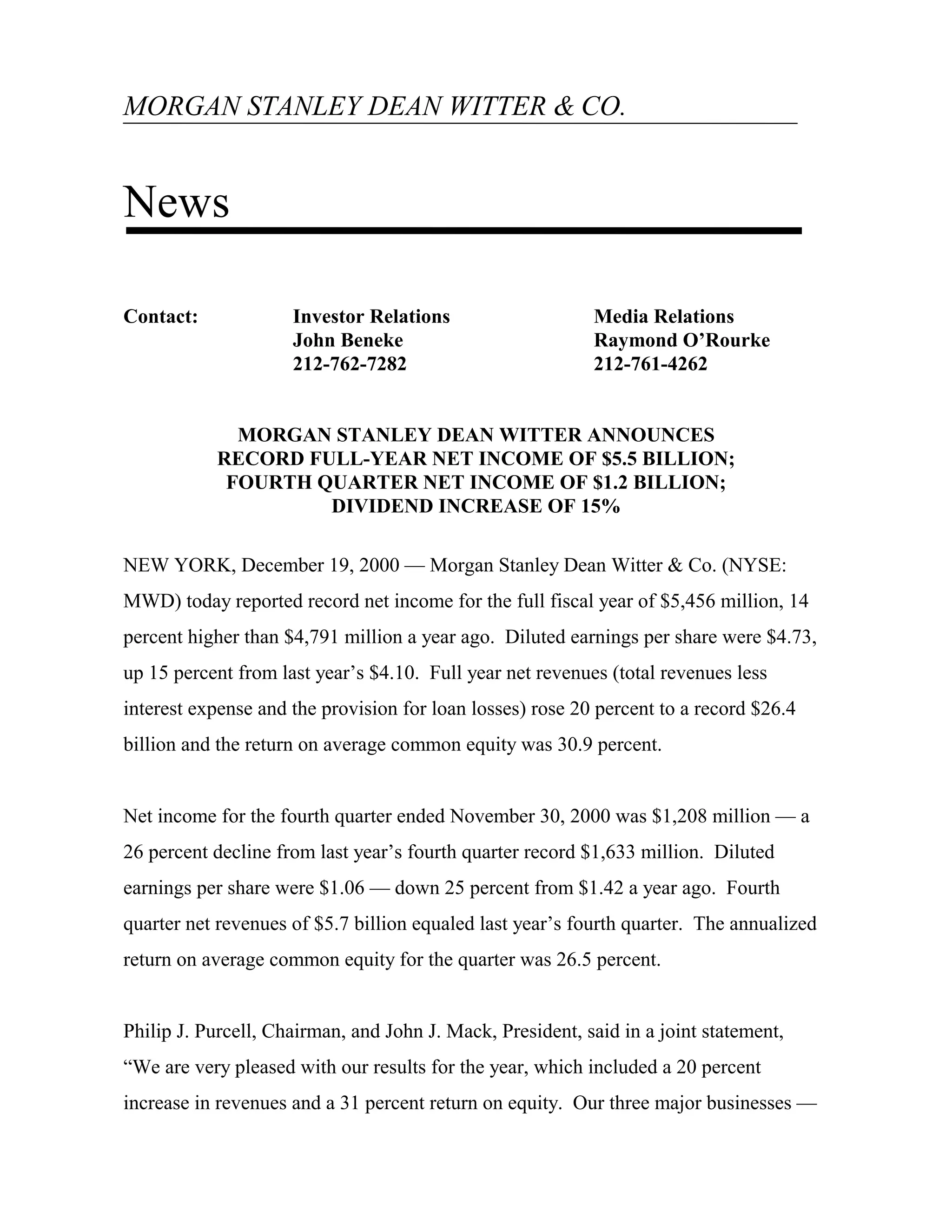 Morgan Stanley Dean Witter announced record full-year and fourth quarter results. For the full year, net income was $5.5 billion, up 14% from the prior year. Fourth quarter net income was $1.2 billion, down 26% from the previous year's fourth quarter. The company's securities, asset management, and credit services businesses all achieved record annual net income. The board also declared a 15% increase in the quarterly dividend to $0.23 per share.