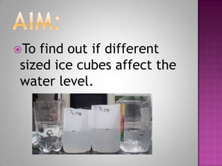 This document describes a science experiment to determine how ice cube size affects water level. Students froze water in 1/4 cup, 1/2 cup and 1 cup measurements to use as ice cubes in separate containers with 600mL of water. They recorded the change in water volume after the ice melted. Results showed water level rose more with larger ice cubes, supporting the hypothesis. The document concludes larger ice cubes affect water level more due to having more water mass as ice.