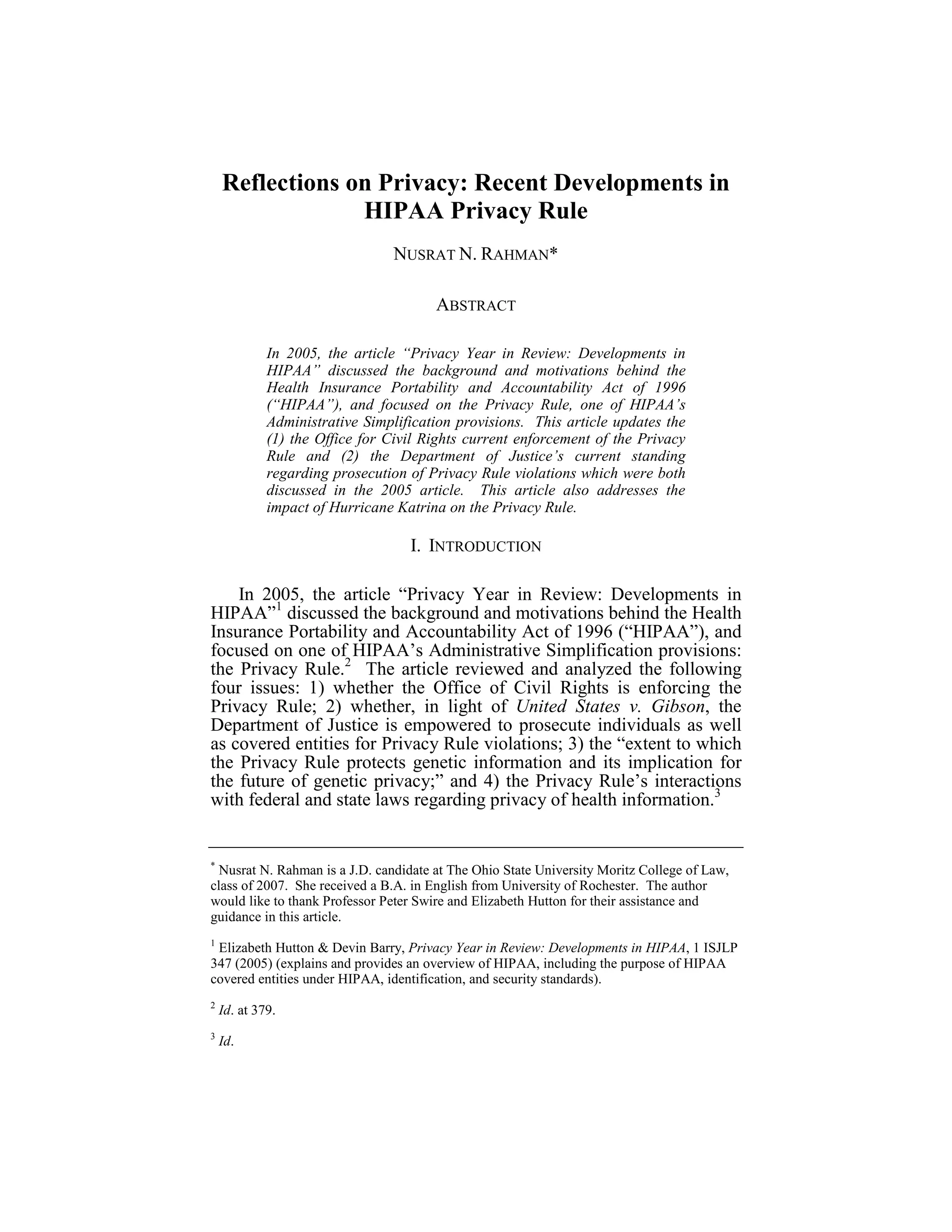 The article updates the enforcement of the HIPAA Privacy Rule and the Department of Justice's ability to prosecute violations, while also addressing Hurricane Katrina's impact on privacy. It discusses how the Privacy Rule protects individually identifiable health information and the penalties for noncompliance, including both civil and criminal consequences. Additionally, the article outlines the efforts of the Office for Civil Rights to promote voluntary compliance among covered entities.