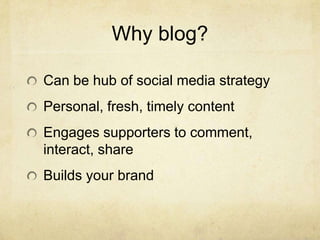 The document discusses using a blog as part of a social media strategy. It notes that a blog can be a hub for social media by providing personal, timely content that engages supporters to interact and share. This builds the brand and improves search engine results while building a subscriber list. The document recommends using stories, images, breaking news, opinions, and calls to action in blog content. It also provides best practices such as inviting and moderating comments, using a simple branded design, encouraging sharing, and including images and keywords for search optimization. Finally, it briefly describes the Blogger platform and notes it is less robust than WordPress options.