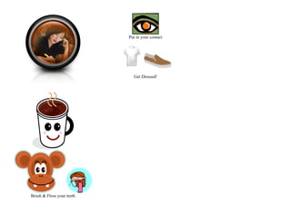 This morning routine document recommends smiling and thanking God for the day, washing one's face, brushing and flossing teeth, putting in contact lenses if worn, and getting dressed.