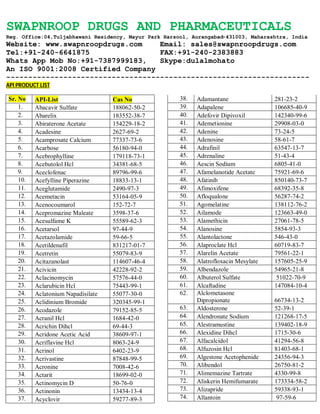 Swapnroop Drugs and Pharmaceuticals is an ISO 9001:2008 certified company based in Aurangabad, Maharashtra, focused on providing affordable, high-quality pharmaceutical products, including active pharmaceutical ingredients (APIs) and herbal extracts. The company aims to expand its product portfolio and strengthen customer relationships, ensuring timely delivery worldwide through trusted courier services. For inquiries and quotations, potential customers can contact them via email or visit their website.
