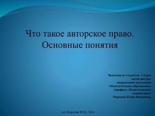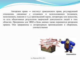 Документ посвящен авторскому праву, определяя его как систему законов, регулирующую создание и использование произведений науки, литературы и искусства. Описываются субъекты авторского права, включая авторов и правообладателей, а также различные виды авторских прав. Упоминаются международные и российские правовые акты, регулирующие защиту авторских прав, а также возможные нарушения этих прав.