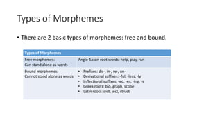 This document discusses morphemes, which are the meaningful parts of words including root words, prefixes, and suffixes. It describes the two types of morphemes - free morphemes which can stand alone as words, and bound morphemes which cannot. It provides examples of common prefixes, suffixes, Greek roots, and Latin roots. It also discusses compound words, affixes, and analyzes data on the most frequent prefixes and suffixes in English.