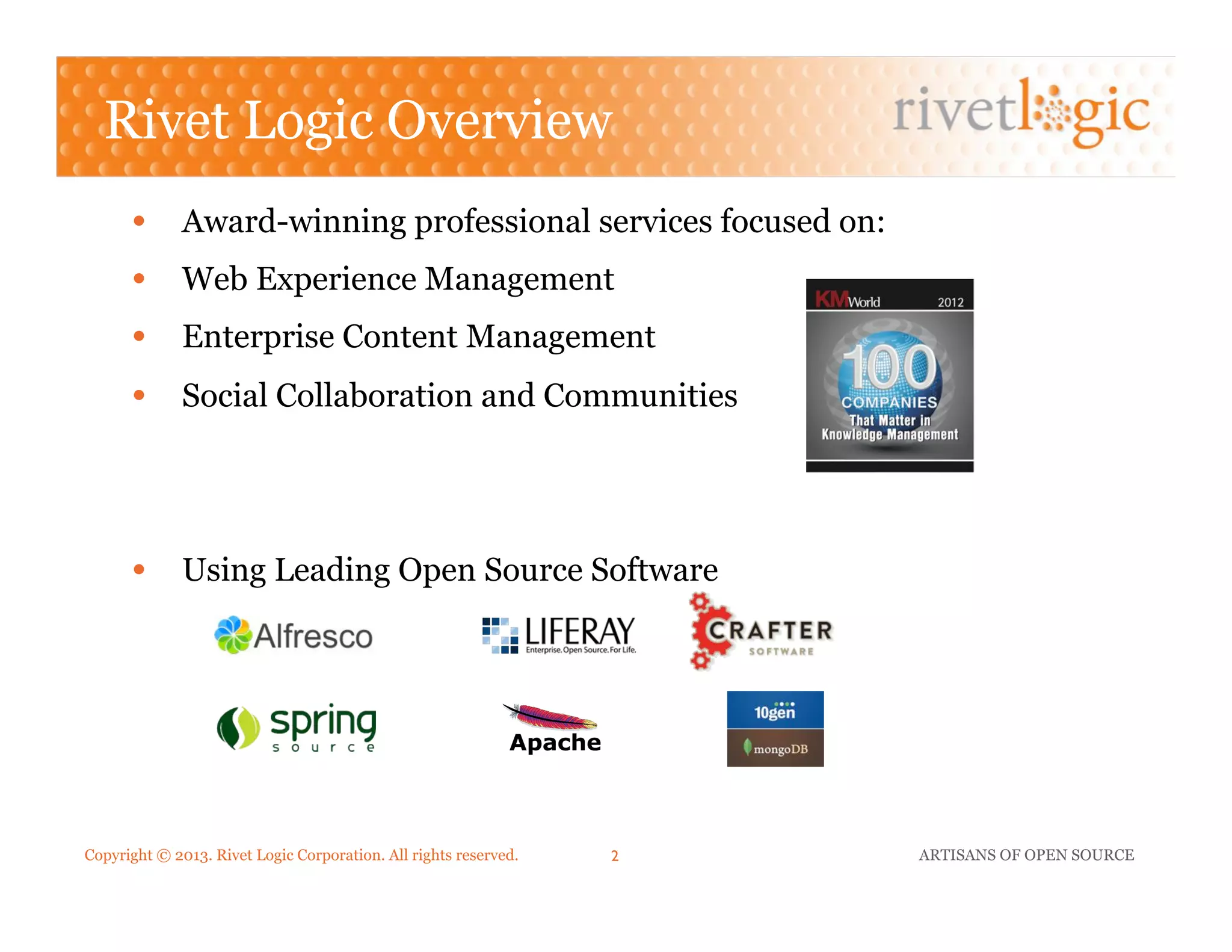 Rivet Logic Corporation, an expert in open source solutions, presents Morpheus Drive, a user-friendly file sharing interface designed for Alfresco to address Dropbox issues. The company specializes in web experience management, content management, and social collaboration, emphasizing the importance of productivity, simplicity, and customization in file sharing. The challenges of traditional file sharing methods, including legal and access control issues, are acknowledged, highlighting the need for secure and customizable alternatives.