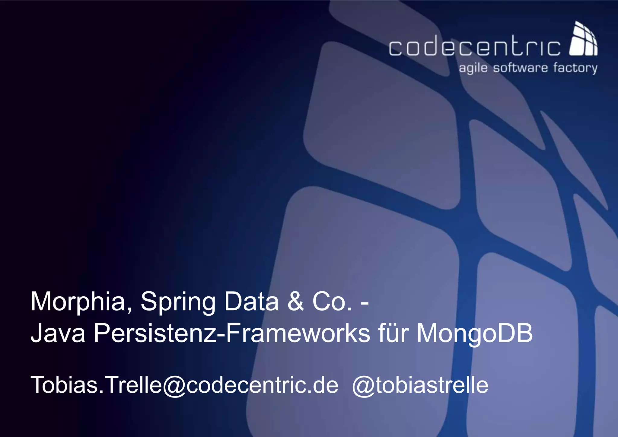 The document provides a comprehensive overview of Java persistence frameworks for MongoDB, highlighting various options like Spring Data MongoDB, Hibernate OGM, Morphia, and Jongo. It discusses features, configurations, and use cases for each framework, along with code snippets for practical implementation. The document also emphasizes the differences between these frameworks and their readiness for production.
