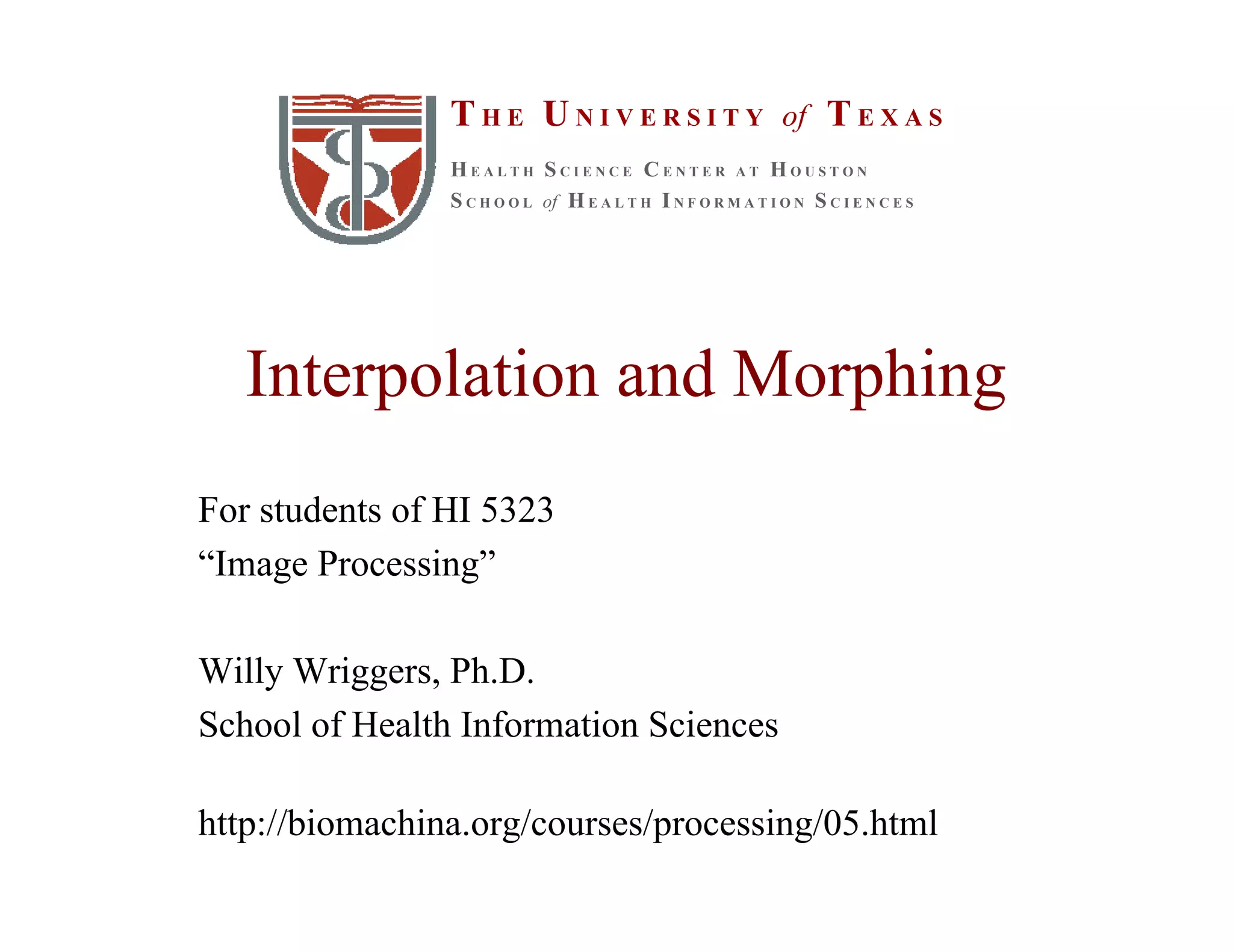 This document discusses various interpolation techniques used in image processing, including nearest neighbor, bilinear, and higher-order interpolation methods. It explains the concepts of forward and backward mapping and how interpolation addresses problems like holes that can occur. Different interpolation kernels are presented, from zero-order (nearest neighbor) to higher-order kernels. Examples of one-dimensional interpolation using these kernels illustrate nearest neighbor, linear, quadratic, and cubic interpolation.