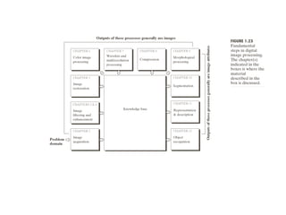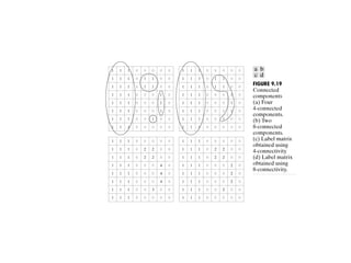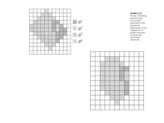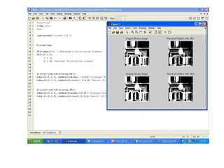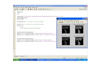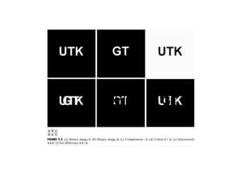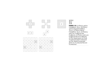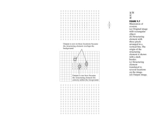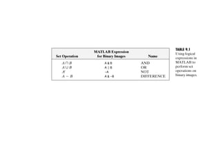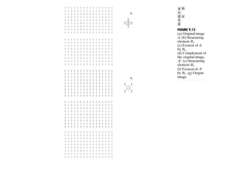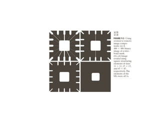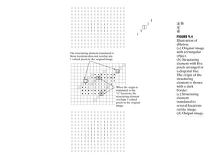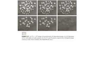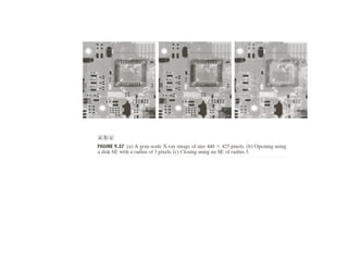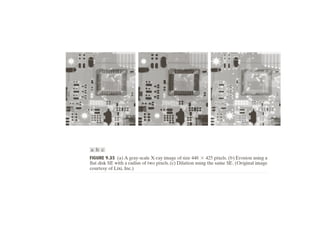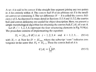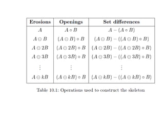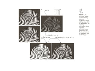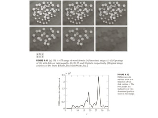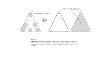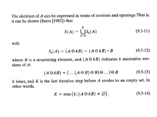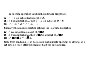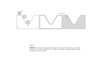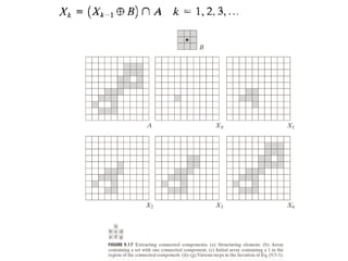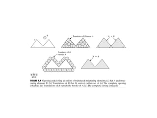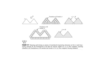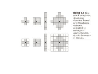 The document discusses various morphological image processing techniques including binary morphology, grayscale morphology, dilation, erosion, opening, closing, boundary extraction, region filling, connected components, hit-or-miss, thinning, thickening, and skeletonization. Morphological operations can be used for tasks like edge detection, noise removal, image enhancement, and image segmentation. The key morphological operations of dilation and erosion expand and shrink binary images using a structuring element, while opening and closing combine these operations to remove noise or fill holes.
