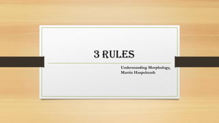 This document discusses morphological rules and patterns. It begins by examining different types of morphological patterns, including concatenative patterns involving affixation and compounding, and non-concatenative patterns involving base modification. It also discusses reduplication and conversion. The document then discusses two approaches to formulating morphological rules - a morpheme-based model that emphasizes similarities between morphology and syntax, and a word-based model that minimizes those similarities. The goal is to create a system of rules that accurately models speakers' linguistic knowledge.