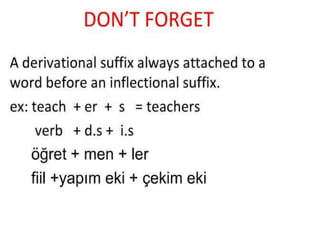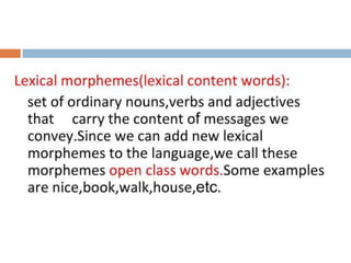 The document discusses morphology, which is the study of word parts called morphemes. There are two types of morphemes: bound morphemes, which cannot stand alone as words, and free morphemes, which can. Prefixes and suffixes are bound morphemes that are added to the beginning or end of root words to change their meaning. Derivational morphemes create new words with different meanings, while inflectional morphemes change grammatical functions. New words can also be formed through processes like compounding, clipping, blending, and meaning changes. The document provides examples to illustrate morphological analysis and the identification of morphemes.