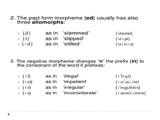 The document discusses different types of morphemes and their roles in word structure. It defines morphemes as the minimal units of morphology. There are two main types of morphemes: free morphemes, which can stand alone as words, and bound morphemes, which cannot stand alone and must be attached to other morphemes. Bound morphemes are further divided into derivational morphemes, which can change a word's class, and inflectional morphemes, which indicate grammatical categories like number or tense. The document also discusses roots, affixes, and combining forms as the main components that make up words.
