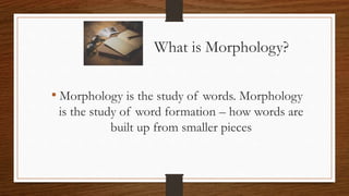 Morphology is the study of words and how they are formed from smaller units called morphemes. There are two types of morphemes: free morphemes which can stand alone as words, and bound morphemes which must be attached to other morphemes. Free morphemes include lexical categories like nouns and verbs, and functional categories like prepositions. Bound morphemes are affixes that can be prefixes or suffixes, and can be either derivational, changing a word's meaning and part of speech, or inflectional, changing a word's grammatical features. Words can be formed through processes like compounding, affixation, conversion, abbreviation and coinage. Allomorphs are