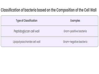 Bacteria come in a variety of shapes and sizes. They can be spherical (cocci), rod-shaped (bacilli), spiral (spirilla), or slender and flexible (spirochetes). Some bacteria arrange in pairs (diplococci), chains (streptococci), or clusters (staphylococci). Bacterial cells have a cell wall, cytoplasm, ribosomes, and often flagella, pili, or a capsule. The cell wall provides shape and some protection, while the plasma membrane controls what enters and exits the cell. Bacteria can form tough endospores to survive unfavorable conditions. Understanding bacterial morphology is important for classification and identification.