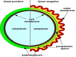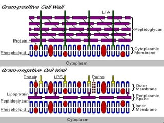 Bacterial cells have several structures that carry out important functions. These include a cell wall and cell membrane that provide shape and protection. Flagella and pili help with locomotion and adhesion. The cytoplasm contains ribosomes for protein synthesis and DNA in the nucleoid region. Some bacteria form spores as resistant structures during unfavorable conditions. Gram-positive and Gram-negative bacteria have differences in their cell wall and membrane compositions that affect staining and antibiotic susceptibility.