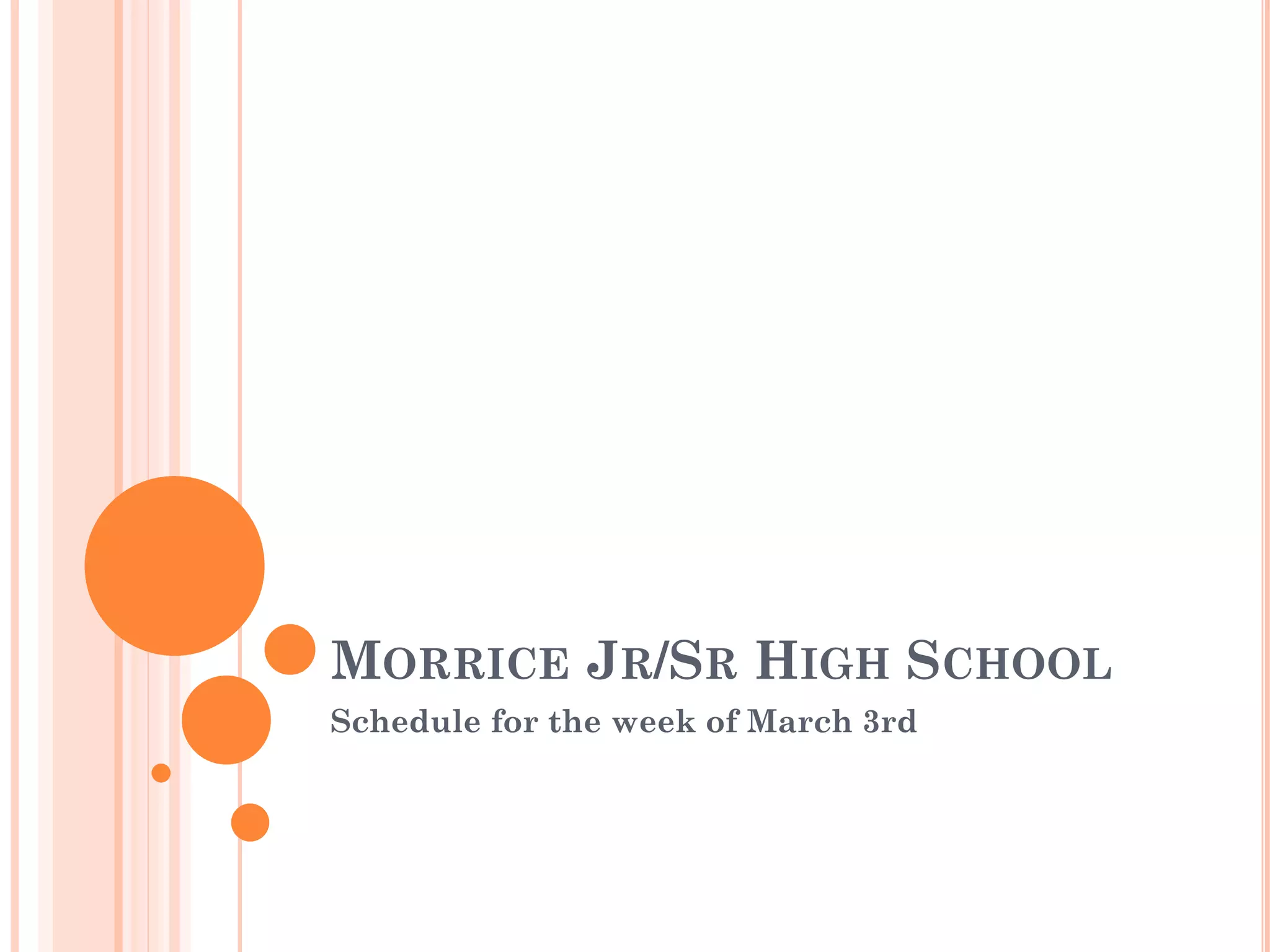 The document outlines the testing schedule and notes for Morrice Jr/Sr High School for the week of March 3rd. On Monday, students are encouraged to eat well and get a good night's sleep to prepare for testing starting Tuesday. Tuesday has various grade levels taking different standardized tests. Notes provide information about lunch times and early dismissal for some grades. Wednesday has juniors taking the WorkKeys test and seniors touring a community college. Thursday has juniors taking another portion of the MME. The document provides additional information and reminders to help guide students through the week of testing.