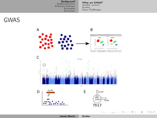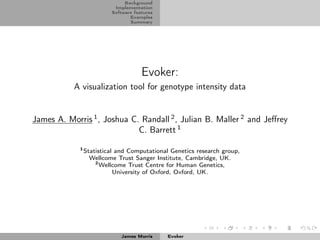 The document discusses Evoker, a visualization tool for genotype intensity data from genome-wide association studies (GWAS). It provides background on GWAS and highlights the importance of rigorous quality control procedures for GWAS to eliminate sources of false positives like poor quality DNA, population structure, and genotyping artifacts. The document then discusses Evoker's implementation and software features for visualizing quality control metrics and genotype intensity data to assist with quality control checks.