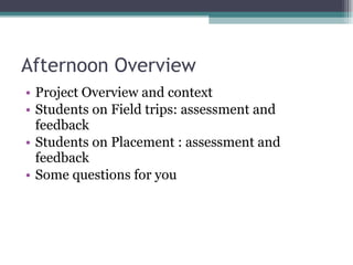 The document outlines a joint project between Kingston and De Montfort Universities focused on enhancing remote student engagement during field trips and placements through mobile and personal technologies. It discusses the challenges and benefits of utilizing educational technology for assessment and feedback, highlighting the importance of mentorship and real-time communication. Key findings emphasize the necessity of structured interactions, the positive impact of technology on motivation, and the need for careful consideration of tools used for educational tasks.