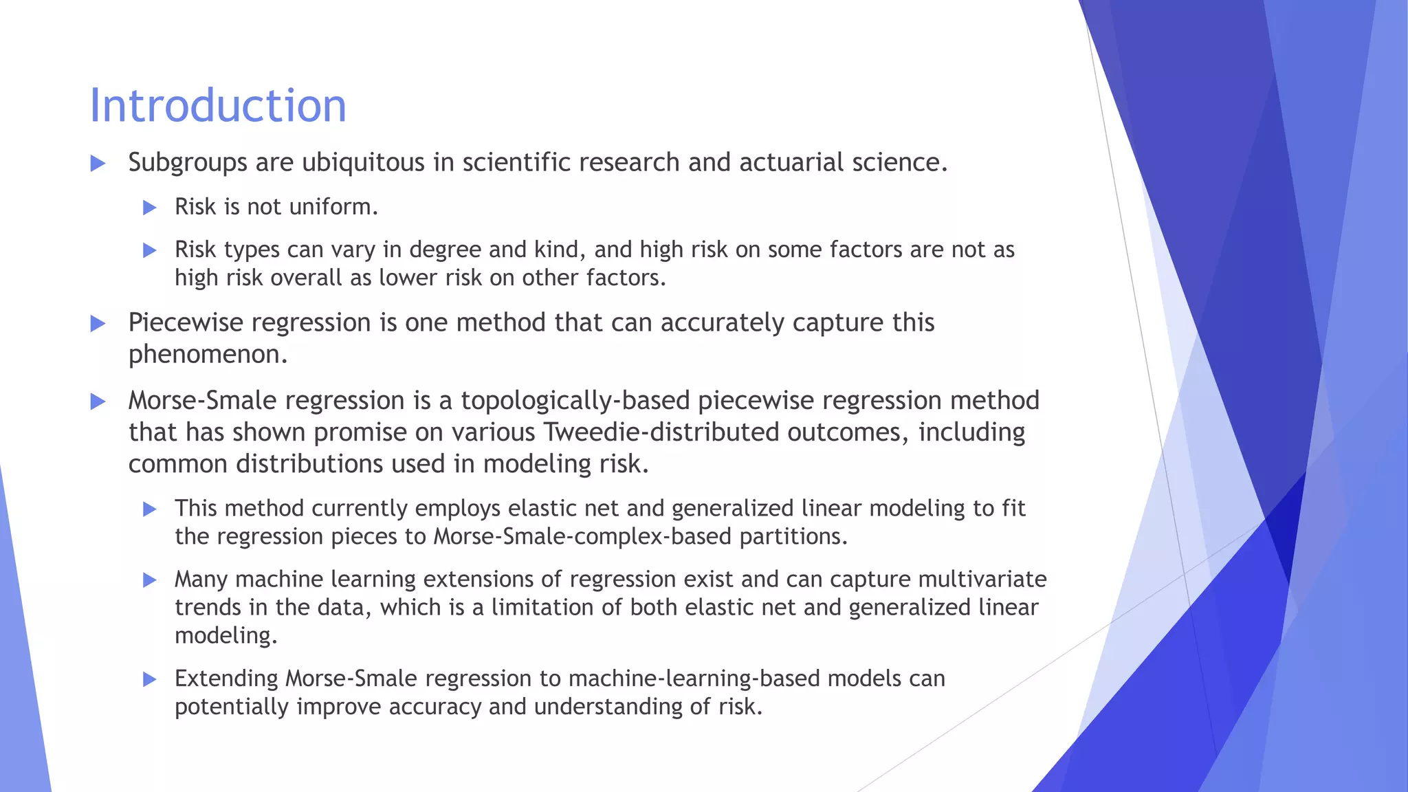 This document discusses the extensions of Morse-Smale regression for risk modeling, emphasizing the method's effectiveness in capturing complex risk types and subgroup variations. The use of machine learning and Tweedie regression is explored, highlighting their advantages in modeling insurance claims and understanding risk structure. Results from simulations and application to Swedish motor insurance indicate that multivariate Morse-Smale regression models perform well and provide valuable insights into risk differentiation.