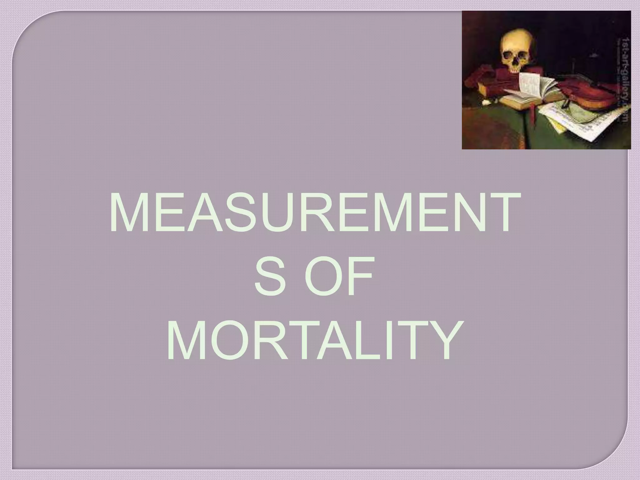 Measures of mortality provide important information for epidemiological studies. They include crude death rate, specific death rates, case fatality rate, proportional mortality rate, and survival rate. Standardized rates allow for comparisons between populations with different age compositions. Some challenges include incomplete reporting, inaccurate information, and non-uniformity across locations. However, mortality measures are useful for explaining trends, prioritizing health issues, designing interventions, and assessing public health programs.