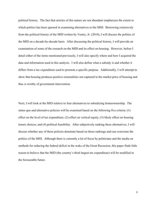 The document discusses the history and politics surrounding the mortgage interest deduction (MID) in the US tax code. It begins by explaining that the MID was originally an unintended consequence of the 1913 Revenue Act, which allowed the deduction of all interest paid, including mortgage interest. Over time, as homeownership increased, the MID became codified in American culture and politically difficult to reform despite its inefficiencies. The document aims to analyze the political history and alternatives to the MID.