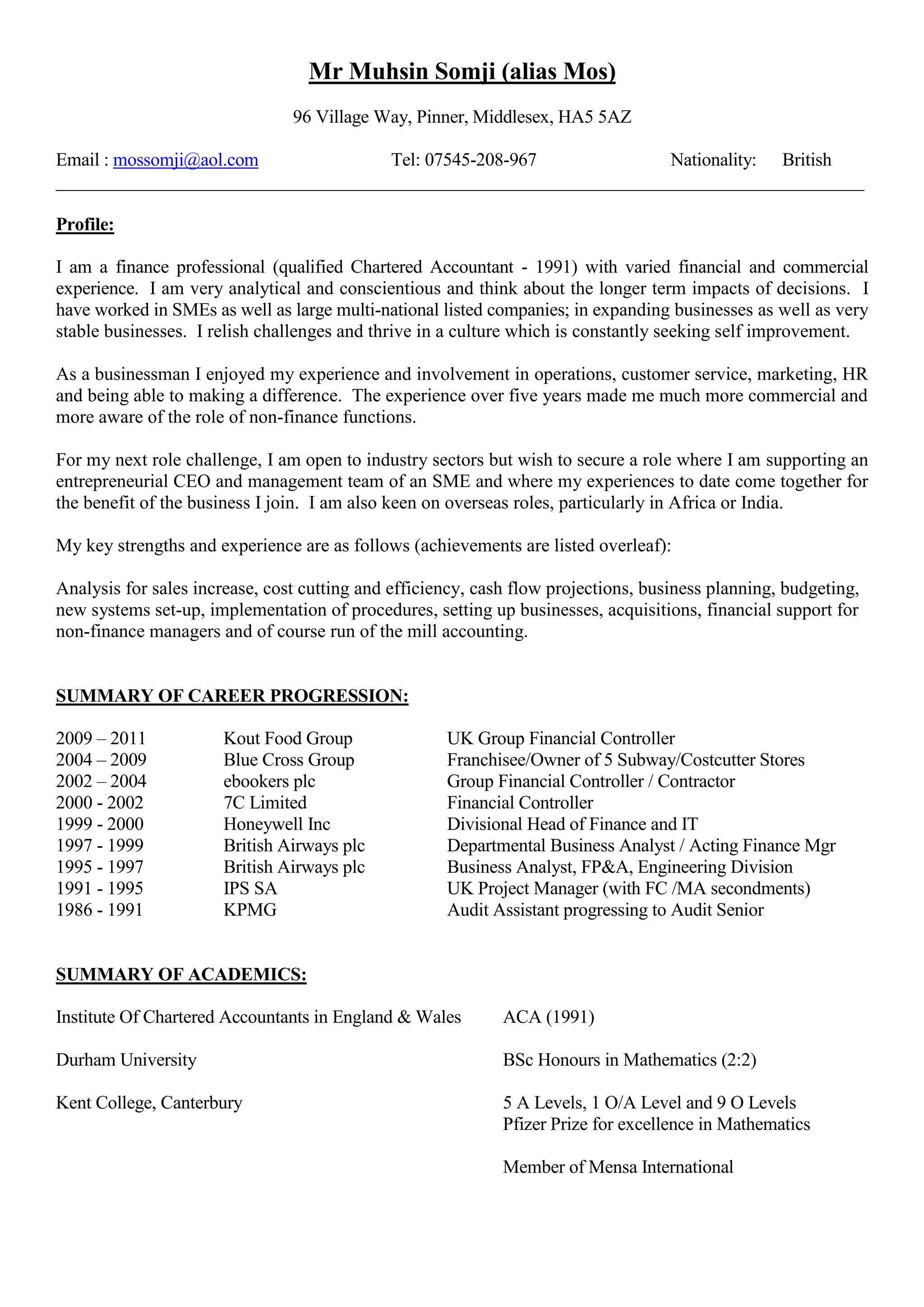 Mr Muhsin Somji is a British finance professional and Chartered Accountant seeking a new role. He has over 25 years of experience in finance, accounting, and business operations for both large multinational companies and SMEs. His experience includes financial analysis, business planning, budgeting, systems implementation, and providing financial support to non-finance managers. He is seeking an entrepreneurial role where he can support a growing SME and apply his analytical and commercial skills.