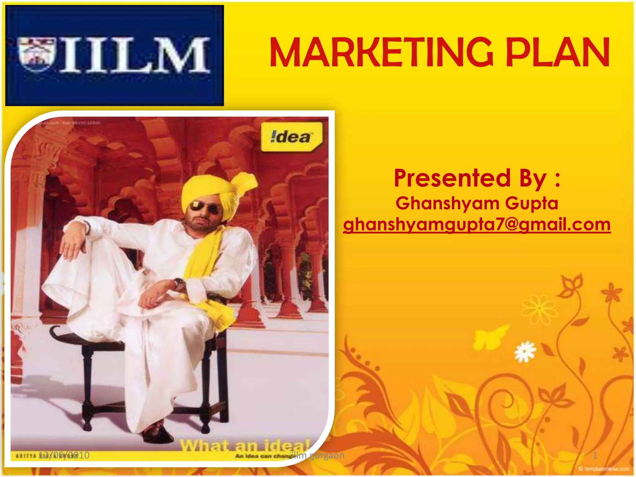 The marketing plan is for Idea, the third largest GSM company in India. It segments the market geographically and demographically, targeting individuals aged 16 to 60 in rural, urban and semi-urban areas. The plan discusses Idea's positioning in terms of call rates and coverage. It performs a SWOT analysis and uses Porter's Five Forces model. The plan outlines Idea's product and service offerings and promotion strategies, which include sponsoring sports teams and green campaigns. It sets a vision to gain 30% market share by 2015 and discusses pricing, physical stores and recommendations to focus on value-added services and local content.