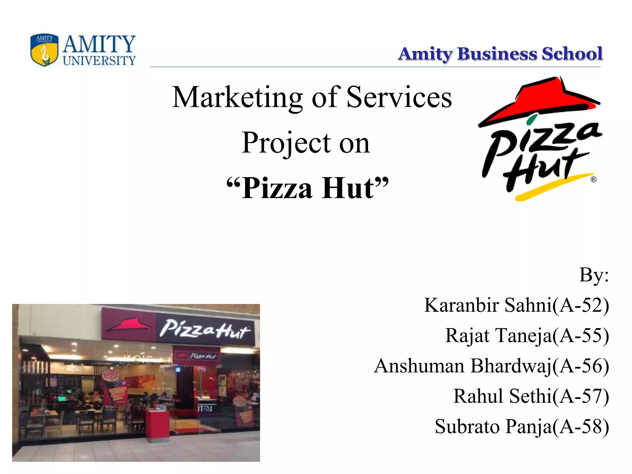 The document summarizes Pizza Hut's services and quality standards. It discusses Pizza Hut's service categories, quality dimensions like reliability and assurance. It provides a blueprint of Pizza Hut's service process, including customer actions, onstage employee actions, and backstage support. It also analyzes Bitner's Servicescape Model and how Pizza Hut designs its environment, uniforms, and service delivery to influence customer experience.