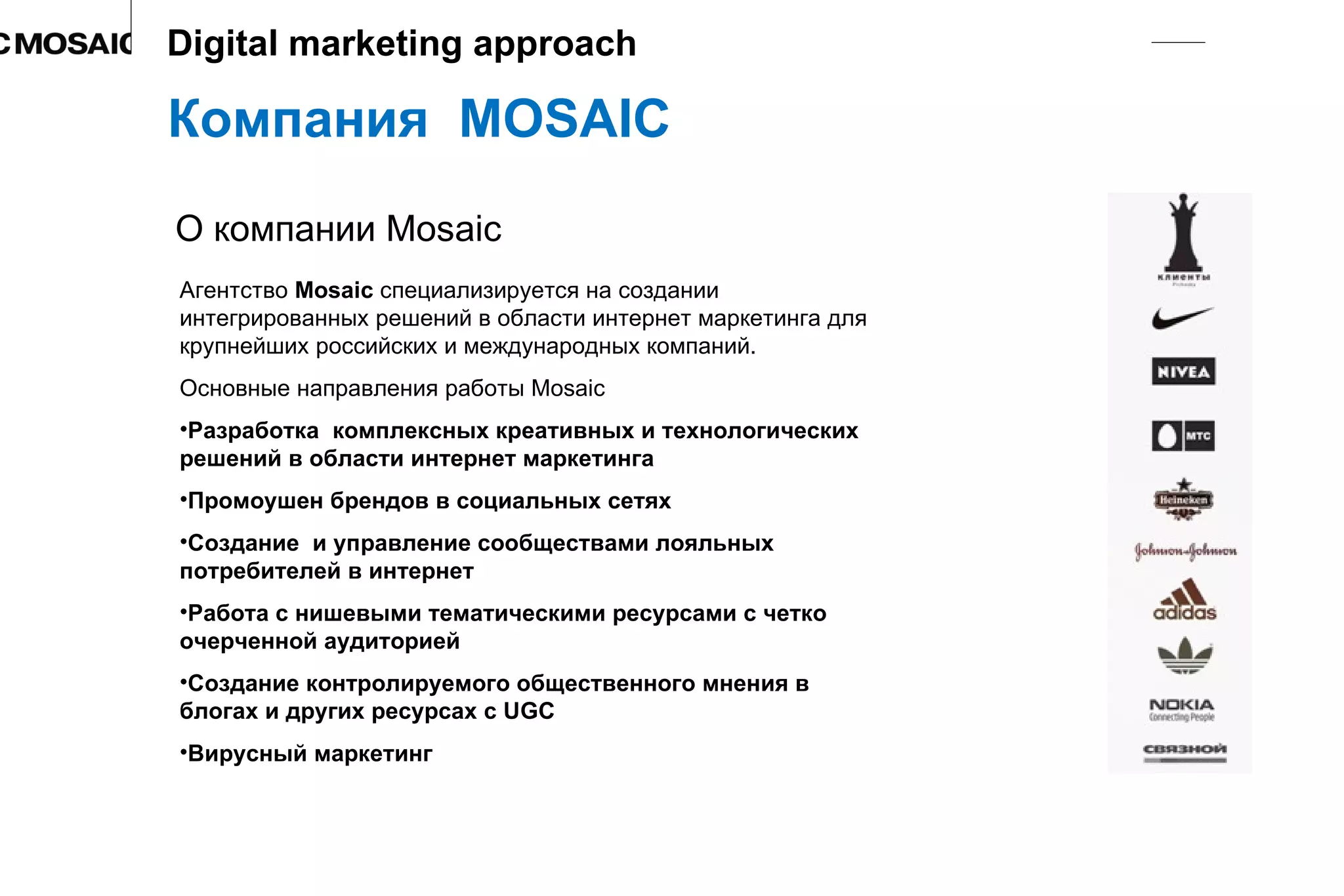 Компания Mosaic Digital Marketing предоставляет интегрированные решения в области интернет-маркетинга для крупных компаний. Основные направления включают вирусный маркетинг, создание сообществ и управление брендовыми промоакциями через различные медиа-каналы. Mosaic успешно реализует проекты для таких брендов, как Nike, Adidas и Microsoft, используя современные цифровые стратегии и виджеты для эффективного взаимодействия с целевой аудиторией.