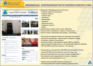 Документ представляет собой описание новостного портала Ульяновска mosaica.ru, который занимает лидирующие позиции в поисковых системах и имеет высокую посещаемость. Портал предлагает рекламные возможности с различными форматами размещения и ценами, а также предоставляет информацию о своей аудитории. Основная целевая аудитория - платёжеспособные менеджеры среднего звена, а контент включает новости, фотогалереи и объявления.