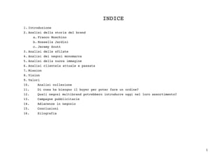 Il documento analizza il brand Moschino, la sua storia, i designer che lo hanno guidato e l'evoluzione delle collezioni. Sottolinea il passaggio da Franco Moschino e Rossella Jardini a Jeremy Scott, che ha introdotto uno stile più eccentrico e giocoso, attirando una nuova clientela, principalmente giovane e internazionale. Infine, il report discute le strategie di vendita, la missione e i valori del brand.