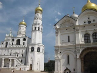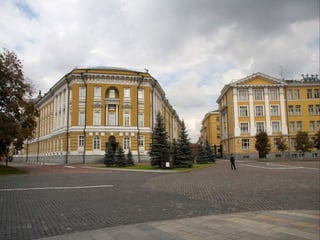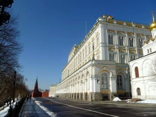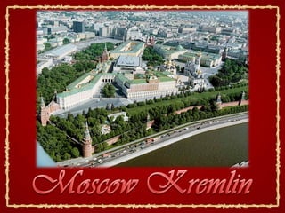 The Kremlin is a historic fortified complex at the heart of Moscow surrounded by walls and occupying 90 acres. It contains many iconic buildings at its center including Cathedral Square with the Cathedral of the Assumption and Ivan the Great Bell Tower. Other notable structures are the Grand Kremlin Palace, Senate Building, Faceted Palace, Terem Palace, and several cathedrals. The Kremlin has long served as the symbolic political center of Russia.