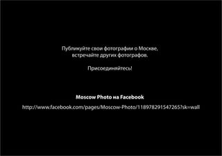 Документ представляет собой приглашение для фотографов присоединиться к сообществу 'Moscow Photo' на Facebook, ориентированному на публикацию фотографий о Москве и ее культуре. Уточняется, что фотографии должны быть оригинальными и выполненными в Москве, а участники получат возможность заявить о себе и найти аудиторию. Авторы акцентируют внимание на значении Москвы как культурной столицы и стремлении российских талантов к международному признанию.