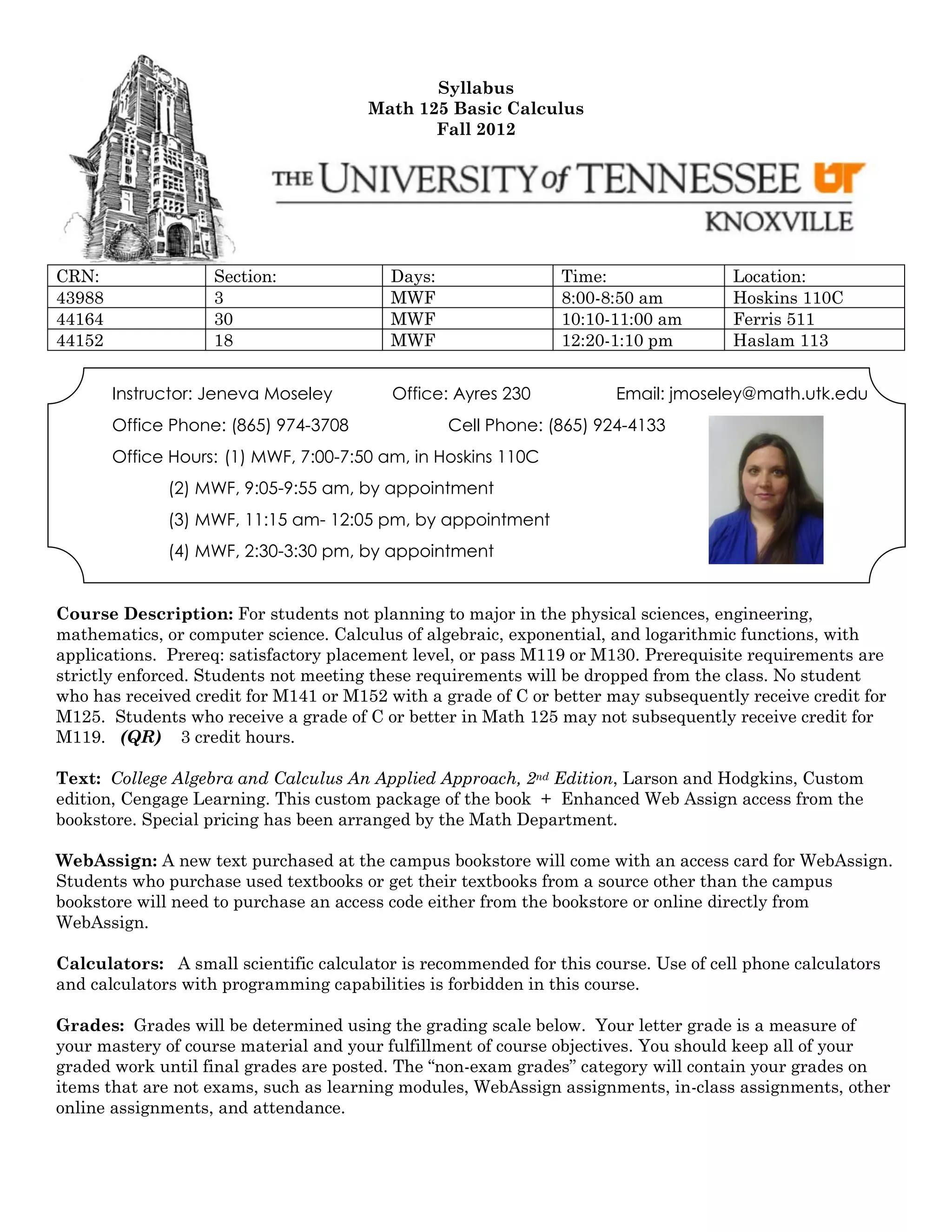 This document is a syllabus for a basic calculus course taught in fall 2012. It provides information on class meeting times and locations, instructor contact information, a course description, required text and materials, grading policies, exam dates and locations, attendance policies, disability and tutoring resources, important due dates, and classroom conduct expectations. The course will cover calculus topics including algebraic, exponential, and logarithmic functions and their applications through homework, exams, and a cumulative final exam.