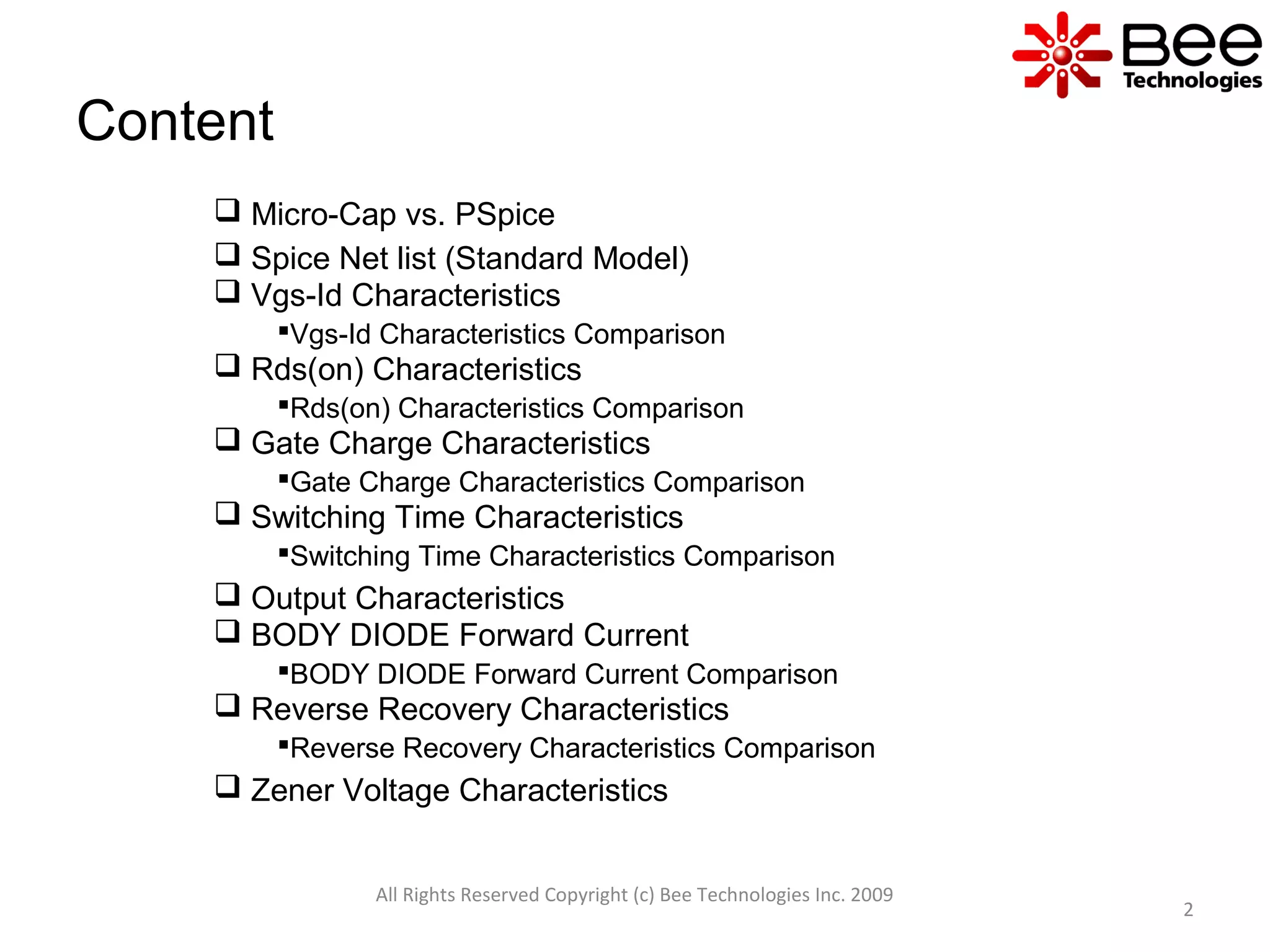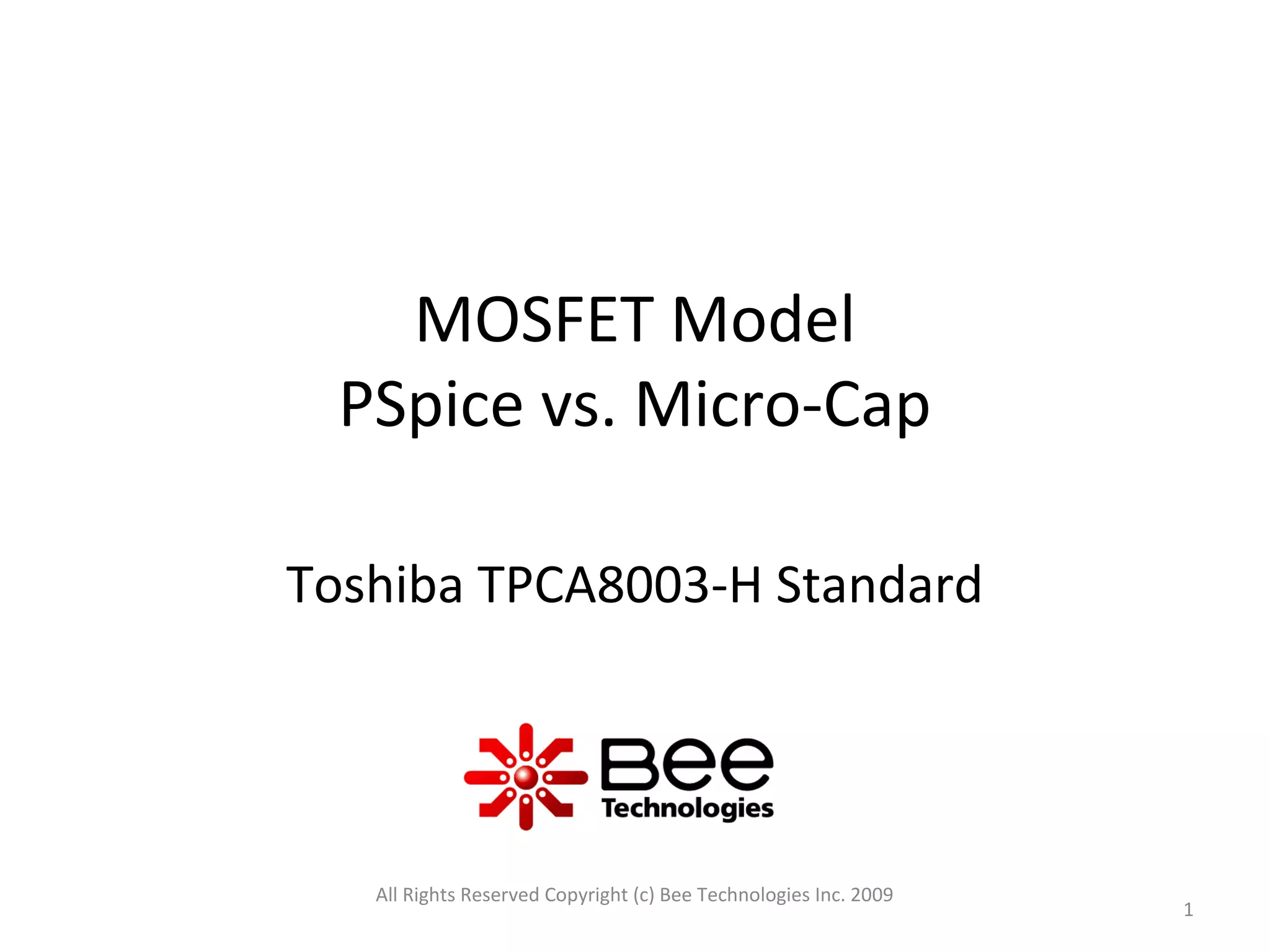 This document compares MOSFET models in Micro-Cap and PSpice simulation software. It includes SPICE netlists for a standard MOSFET model and compares characteristics such as Vgs-Id, Rds(on), gate charge, switching time, output characteristics, and body diode forward current between the two simulators. Minor parameter differences are noted between the Micro-Cap and PSpice models.
