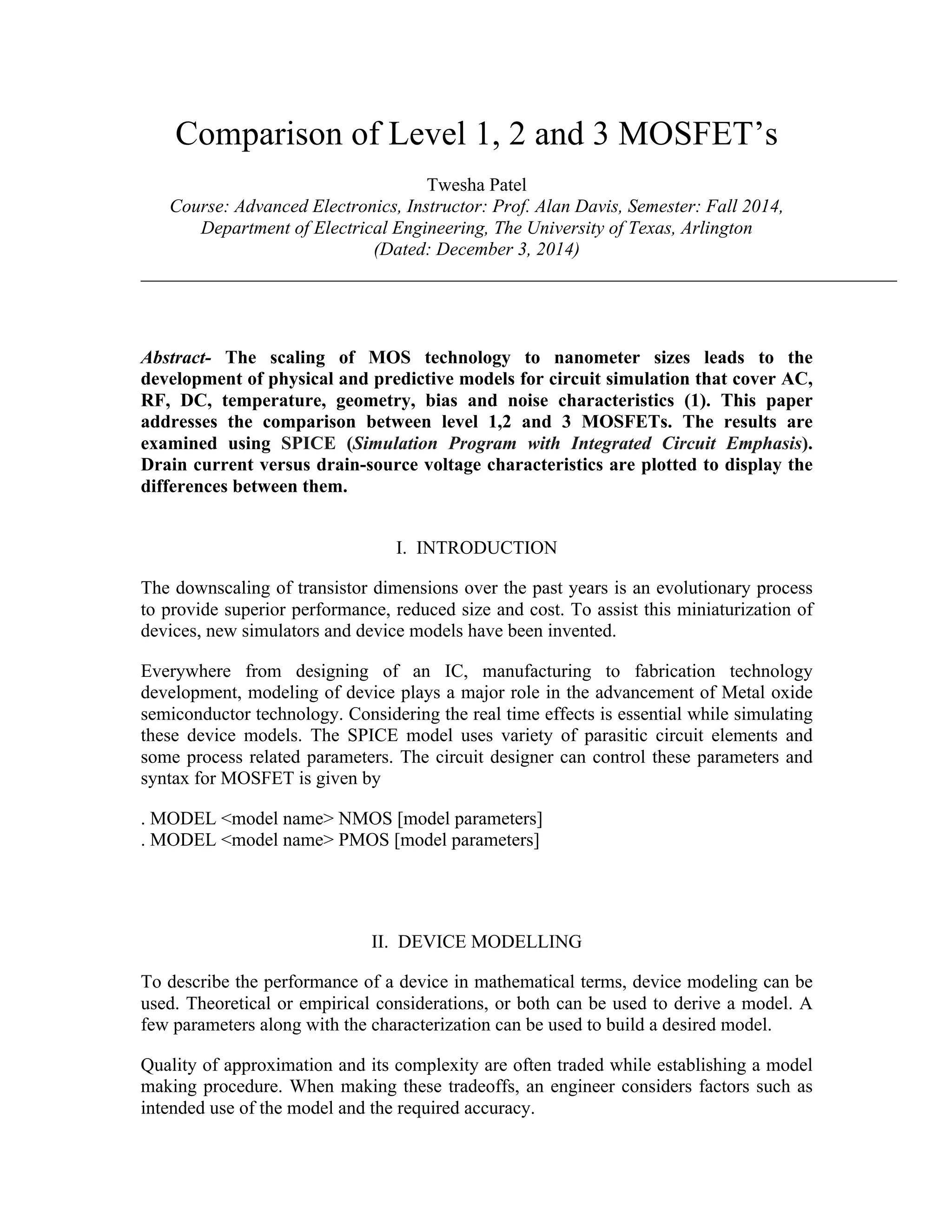 This document compares level 1, 2, and 3 MOSFET models in SPICE simulations. It provides background on device modeling and outlines the key equations that define each model level. Level 1 is the simplest model and does not account for short channel effects. Level 2 includes mobility degradation and threshold voltage variations. Level 3 has similar accuracy to level 2 but faster simulation time and better convergence. Drain current versus drain-source voltage characteristics are plotted to show differences between the models.