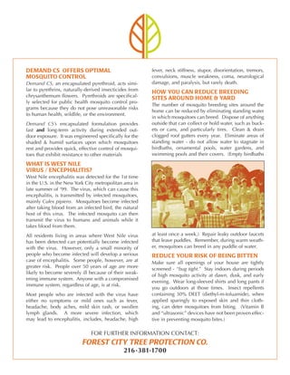 Forest City Tree Protection Co. offers mosquito control services aimed at protecting residential yards from adult mosquitoes, specifically targeting those that transmit West Nile Virus and encephalitis. Their programs include a basic 3-application service and a full season 4-application service, both designed to reduce mosquito populations effectively with minimal environmental impact. The company also provides guidelines for reducing breeding sites and tips for personal protection against bites.
